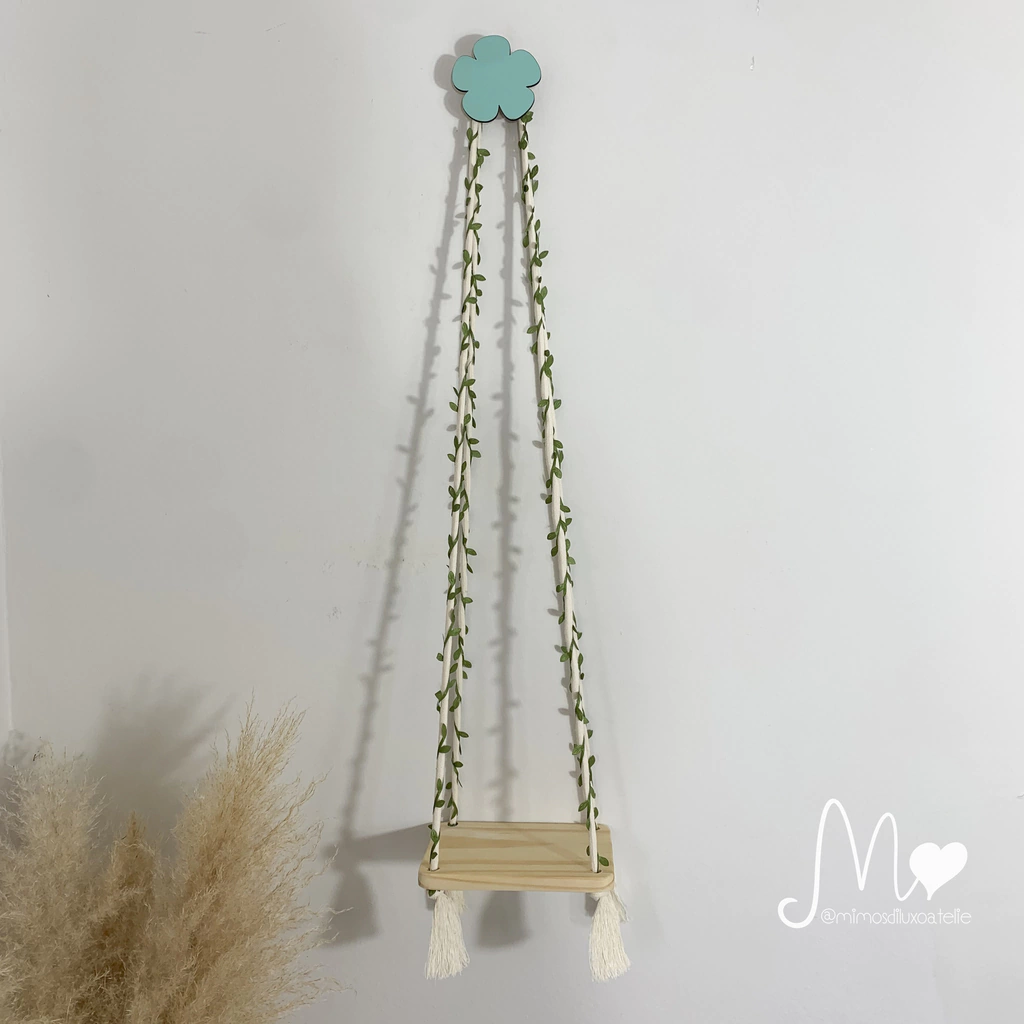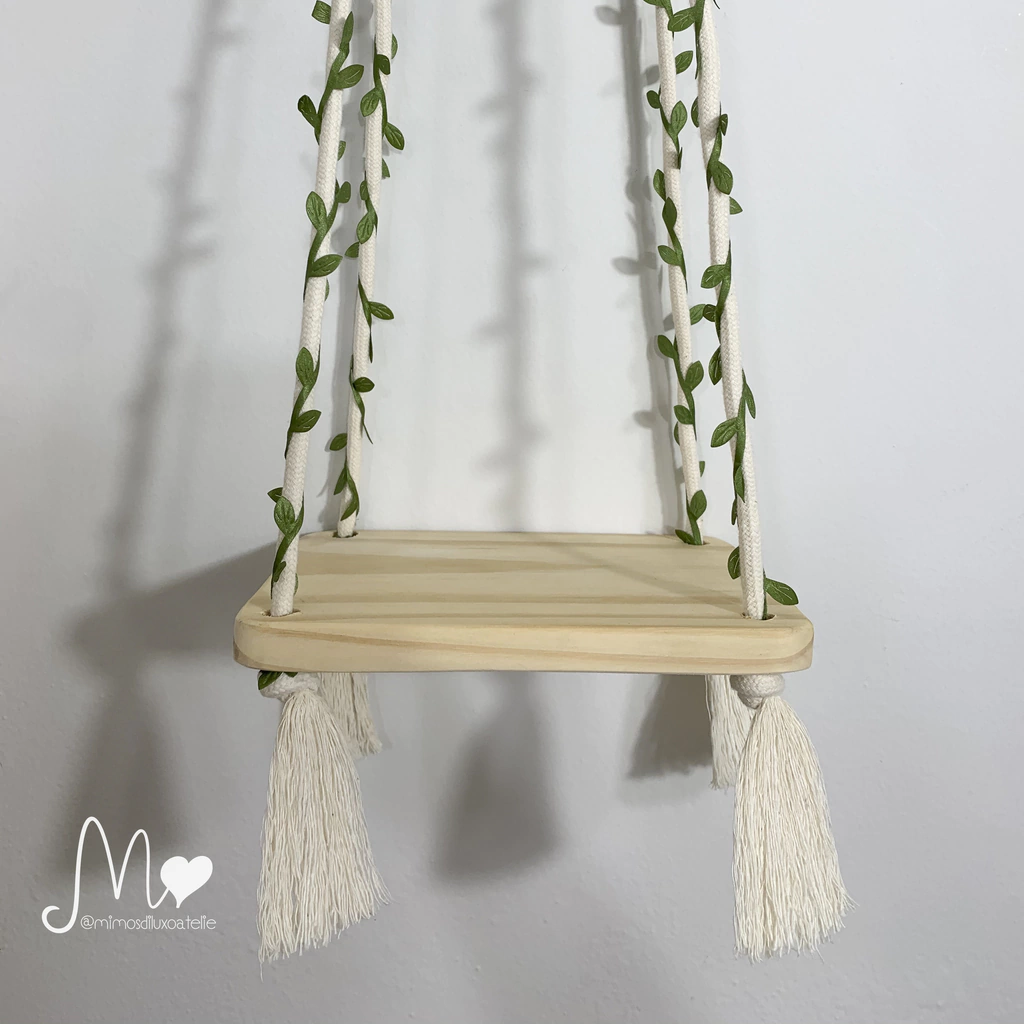 Incluso: 1 balanço em madeira pinus natural e corda de algodão com mini folhas verdes. com gancho escolhido dentro das opções de seleção.