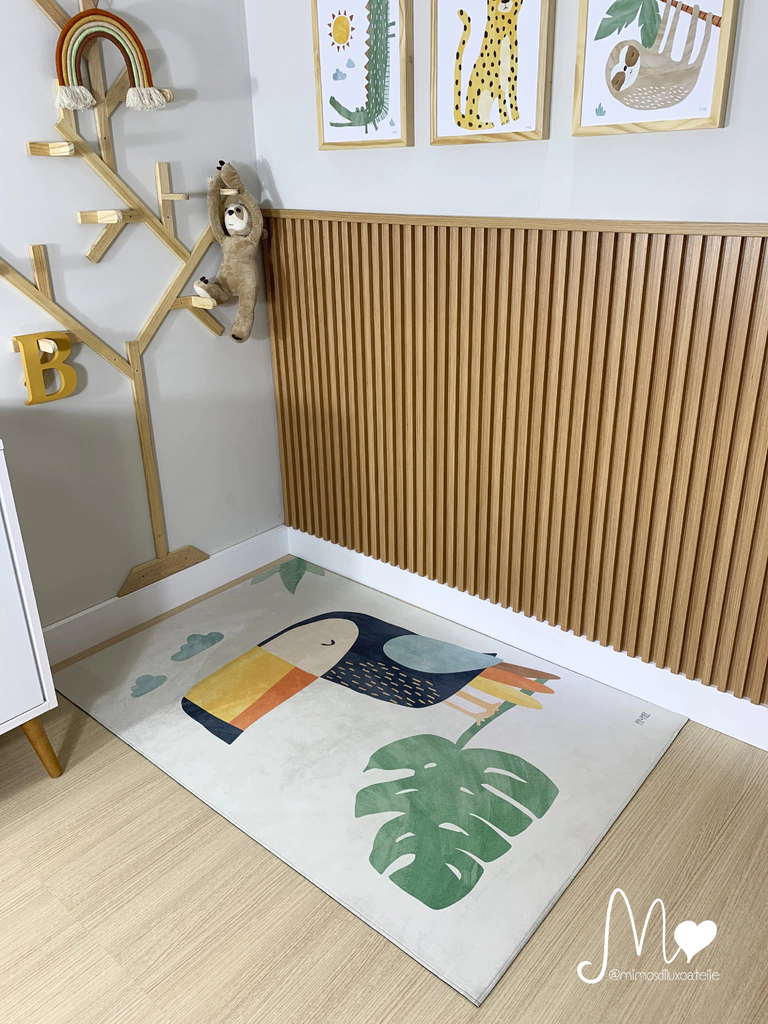Tapete playmat Mimos tucano fauna brasileira. Os tapetes playmats Mimos reunem estilo, designer divertido e moderno aliados a praticidade da versão playmat. Fácil manutenção, não acumula pó, aderem ao piso sem ficar levantando as bordas, é antiderrapante e impermeável. E tudo nos modelos Mimos possuem o diferencial de um toque macio, camurçado. É um produto nacional e exclusivo de alta qualidade.