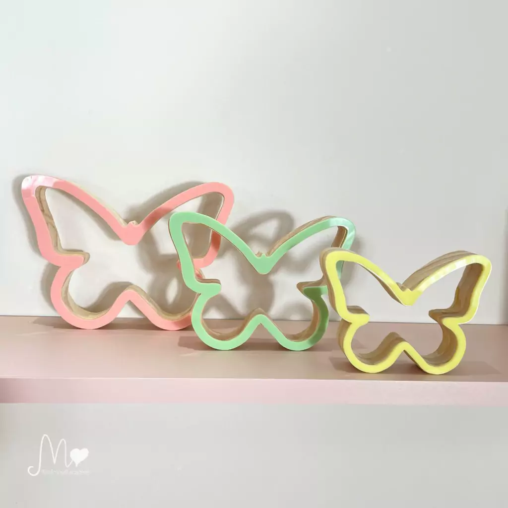 Trio de borboletas em madeira com aplique em arílico colorido, com fundo vazados. Cores da foto (rosa - verde - amarelo).
